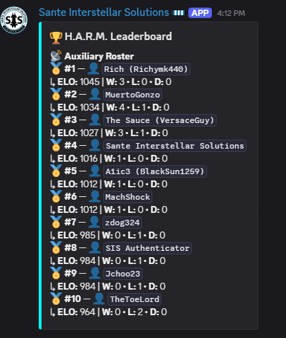 H.A.R.M.Our Elo-based dogfighting system ranks pilots based on their performance in structured 1v1 PvP duels, providing a competitive ladder to measure individual skill, track improvement over time, and reward tactical mastery in ship-to-ship combat.